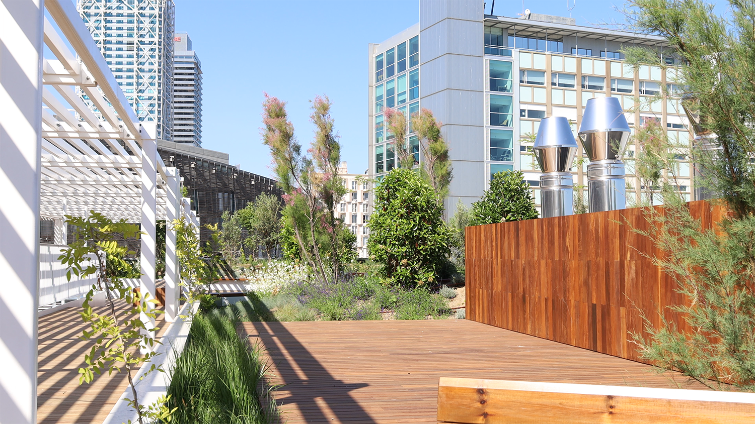 No s'hi pot menjar Aquest jardí no està pensat per fer-hi àpats. El jardí s'ha dissenyat amb làmines de fusta que faciliten el drenatge, però no permeten una neteja fàcil si hi cauen restes. A més, per mantenir una bona higiene, cal evitar menjar-hi, ja que pot atreure coloms i gavines que embruten l'espai i alteren la tranquil·litat del jardí.